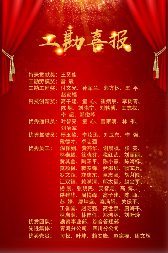 工勘巖土集團(tuán)勘察事業(yè)部、綜合管理部榮獲“優(yōu)秀團(tuán)隊(duì)”;青海分公司、四川分公司榮獲“先進(jìn)集體”;溫佩嫻等44名員工榮獲“優(yōu)秀員工”;葉碧亮等5名員工榮獲“優(yōu)秀通訊員”;楊玉峰等5名員工榮獲“優(yōu)秀駕駛員”;高子建等10名員工榮獲“科技創(chuàng)新獎(jiǎng)”;付文光等5名員工榮獲“工勘工匠獎(jiǎng)”;雷斌榮獲“工勘勞模獎(jiǎng)”;王賢能榮獲“特殊貢獻(xiàn)獎(jiǎng)”;習(xí)松等5名黨員被評(píng)為“優(yōu)秀共產(chǎn)黨員”。集團(tuán)高管為獲獎(jiǎng)團(tuán)體及個(gè)人頒發(fā)榮譽(yù)證書。